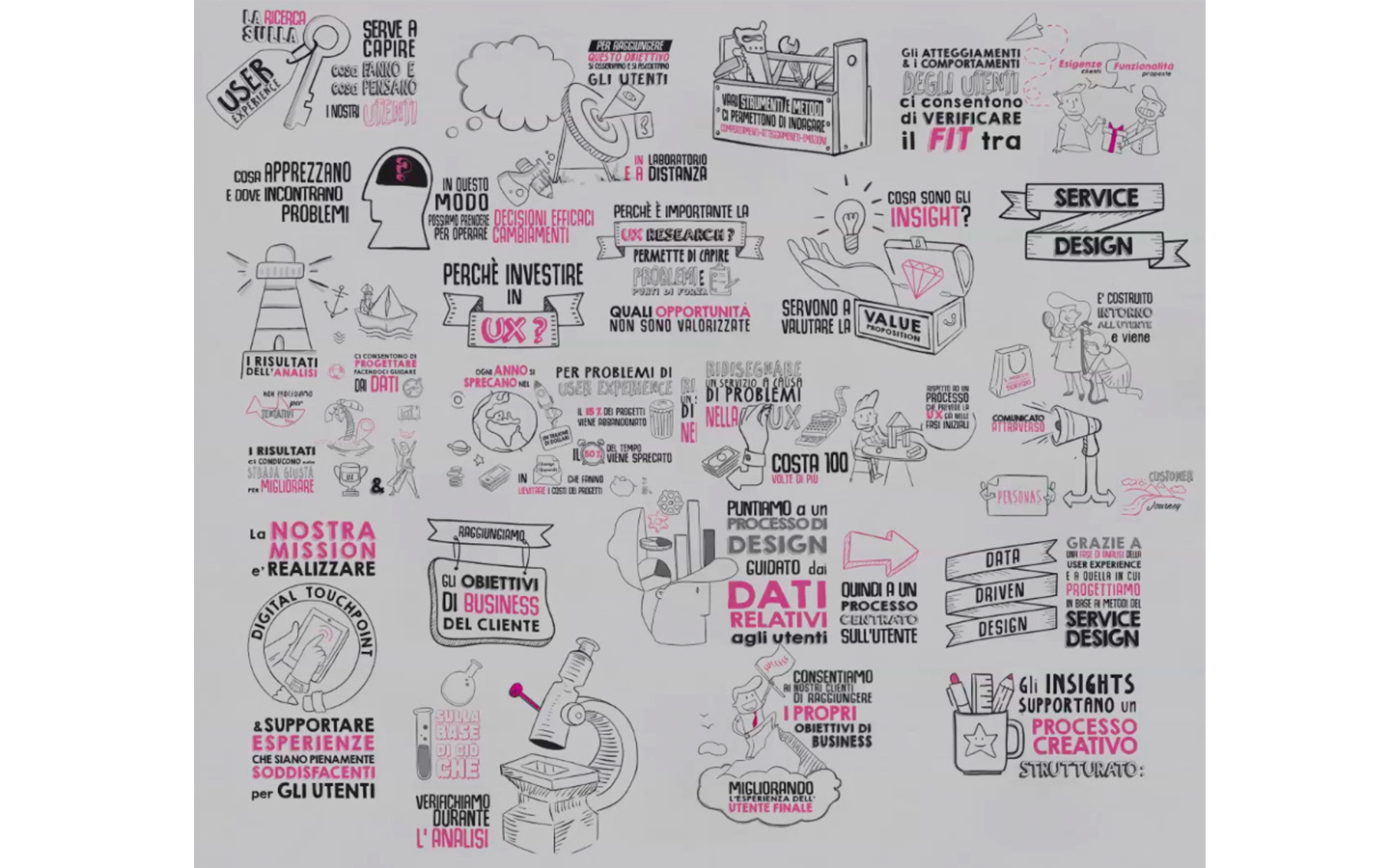 Illustration, graphical assets and art direction for this video promotional for the agency Conflux, that shows what is user experience and what is a structured design process.